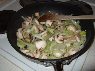 For tea tonight I'm using up some leftover bits of chicken and turkey. I soften some chopped onion, chopped mushrooms and a bit of leek in butter.