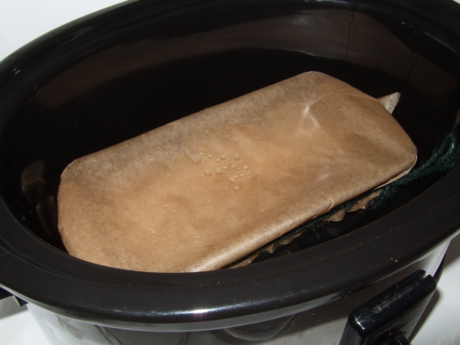 I'm cooking mine in the slowcooker. I've covered the loaf tin with baking parchment and secured it with string. This is then placed in the slowcooker on low with a litre of water in the slowcooker.